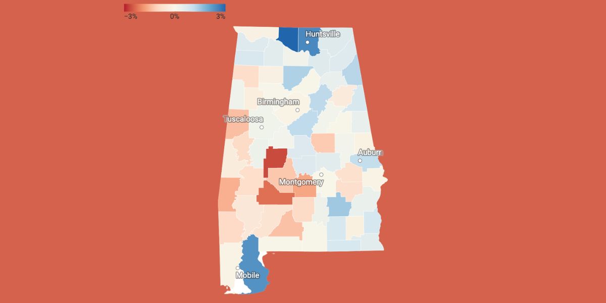 The divergence highlights a broader shift in where growth is occurring across Alabama.