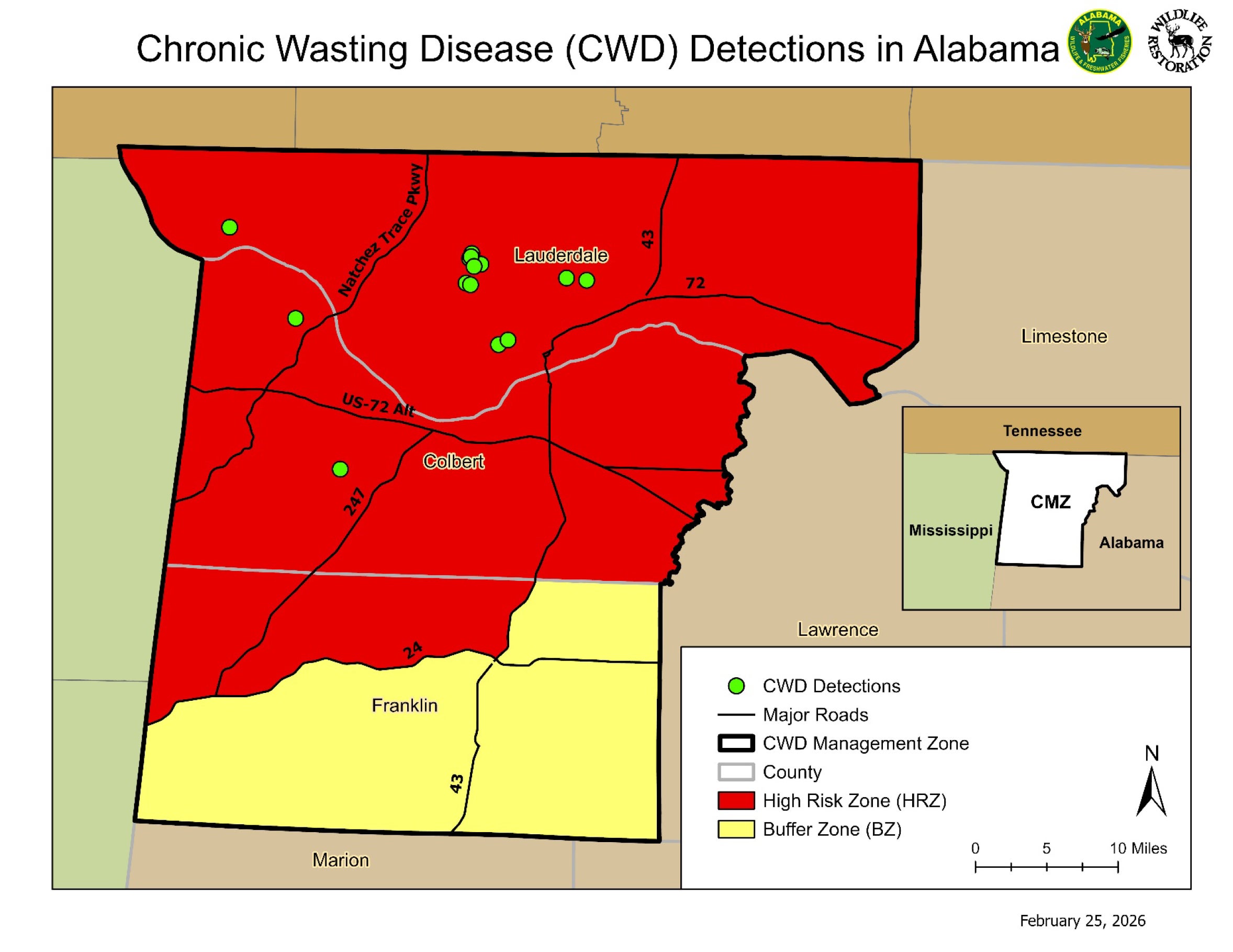 The CMZ, which was established after WFF’s first detection of CWD, includes all of Lauderdale, Colbert, and Franklin counties. Within the CMZ, the High-Risk Zone (HRZ) includes all of Lauderdale and Colbert counties and a portion of Franklin County. The HRZ portion of Franklin County extends north of State Highway 24 from the Alabama/Mississippi state line east to U.S. Highway 43. The remainder of Franklin County south of State Highway 24 and east of U.S. Highway 43 has been designated as a Buffer Zone within the CMZ.